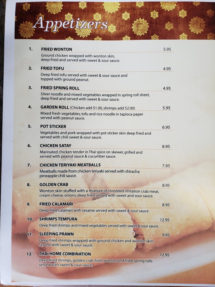 Introducing the menu at Thai Home Restaurant, located in Sandy, Oregon, promises a delightful culinary experience. With a focus on authentic Thai flavors, the menu offers a diverse range of dishes, from classic favorites like basil fried rice and papaya salad to more unique options like sizzling eggplant. The restaurant's cozy ambiance, charming outdoor seating, and friendly service create a welcoming atmosphere for diners. Customers rave about the delicious food, attentive staff, and reasonable prices. Whether dining in or taking out, Thai Home Restaurant impresses with its fresh ingredients, flavorful dishes, and top-notch customer service. Don't miss out on the opportunity to savor traditional Thai cuisine in the heart of Sandy.